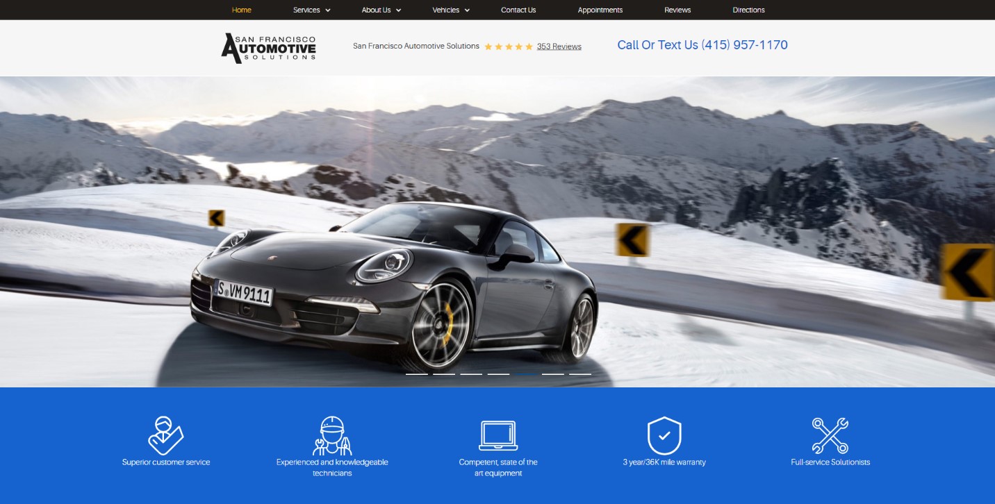با دیدن صفحهٔ اول این سایت چه میفهمید؟ بله درست حدس زدید این یک تعمیرگاه حرفهای مختص خودروهای لاکچری است. یک سایت باید از بدو ورود مشخص کند که مربوط به یک تعمیرگاه عمومی یا اختصاصی است. این سایت با طراحی، تصاویر و متون درست خود بهخوبی این کار را انجام داده است.