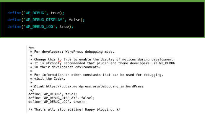 - WP_DEBUG را فعال کنید: فایل wp-config خود را به کد زیر بهروز کنید: