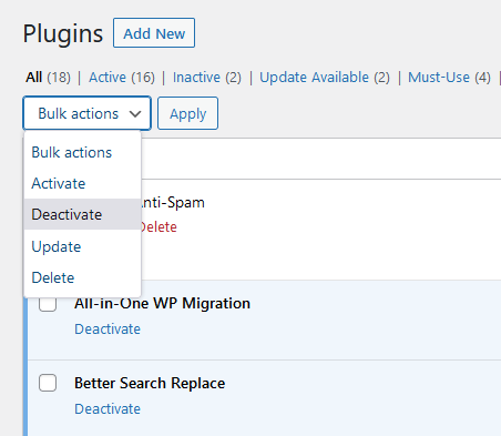 نام wp-content/plugins را به plugins-disabled تغییر دهید. اگر این کار مشکل را برطرف کرد، بدانید که مقصر آن یک یا چند پلاگین در وبسایت شما است و با تغییر نام جداگانهٔ هر دایرکتوری پلاگین میتوانید عیبیابی بیشتری کنید. اگر تغییر نام کل دایرکتوری افزونهها مشکل را برطرف نکرد، پس پلاگینهای شما علت اصلی مشکل به وجود آمده نیستند.