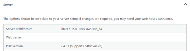 خود وردپرس یک نمودار مفید ارائه میدهد که در آن نشان میدهد کدام نسخههای PHP با نسخه وردپرس شما هماهنگ است. میتوانید با رفتن به داشبورد وردپرس خود و سپس Tools > Site Health > Info ، بررسی کنید که از کدام نسخه استفاده میکنید. در نهایت بخش Server را در آن گسترش دهید تا جزئیات مربوط به نسخه PHP خود را بیابید.