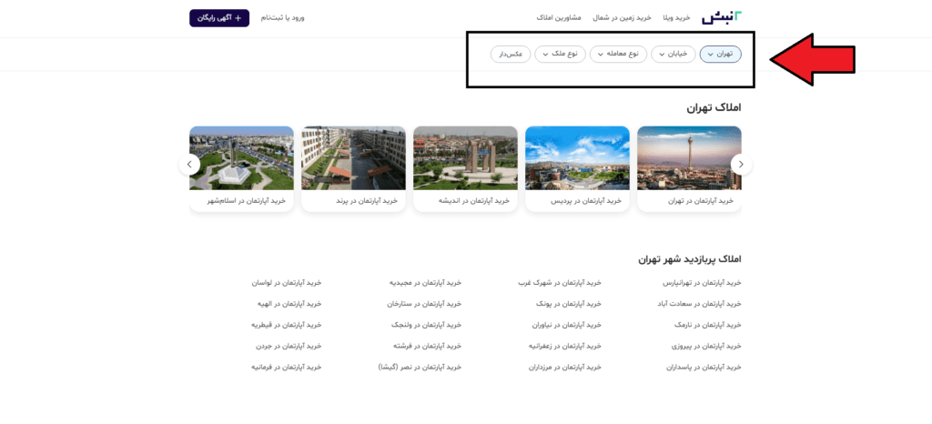 این سایت یک نمونه وب سایت املاک ایرانی محسوب می‌شود که علاوه بر داشتن سادگی بصری دارای چندین فیلتر در بالای صفحه ی خود می باشد تا جستو جو را برای شما آسان تر کند. علاوه بر دسترسی ساده برای یافتن ملک، این سایت در پایین صفحه ی خود خدمات مربوط به مالکین و مشاورین املاک را از هم جدا کرده تا راحت تر بتوانند با سایت همکاری کنند. اگر بخواهیم فقط دو صفت برتر این سایت را بگوییم، بدون شک کاربری راحت و سادگی بصری برنده خواهند بود.